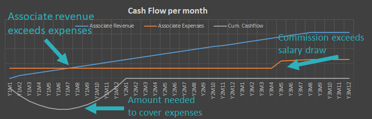 Calculate the revenue generated by the production profile. Consider expenses associated with hiring an associate. Determine the total financial risk or cash required to hire an associate before their production covers their expenses. Considering the compensation model, expenses increase when production exceeds the cumulative salary draw.