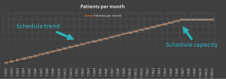 Model the number of patients estimated per week and the rate at which weekly appointments increase until capacity is reached. Capacity is based on appointments scheduled per hour and hours per week.